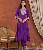 • Product Id : 4581140 • Package Details : 1 Top/1 Bottom/1 Dupatta • Type : Anarkali Suit • Work : Embroidered • Sleeve : Quarter Sleeve • Fabric : Silk • Color : Purple • Stitching : Stitched Payments [+]