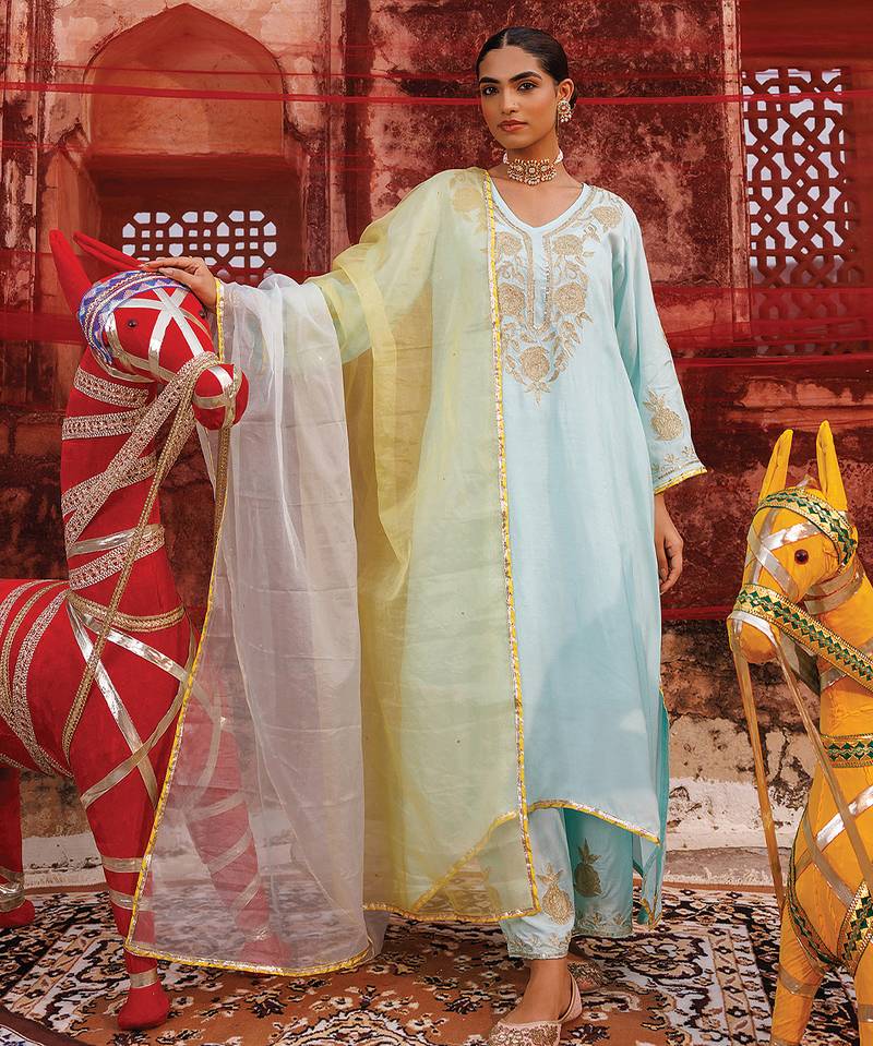 Blue Embroidered Chanderi Kurta Set With Dual Shaded Dupatta