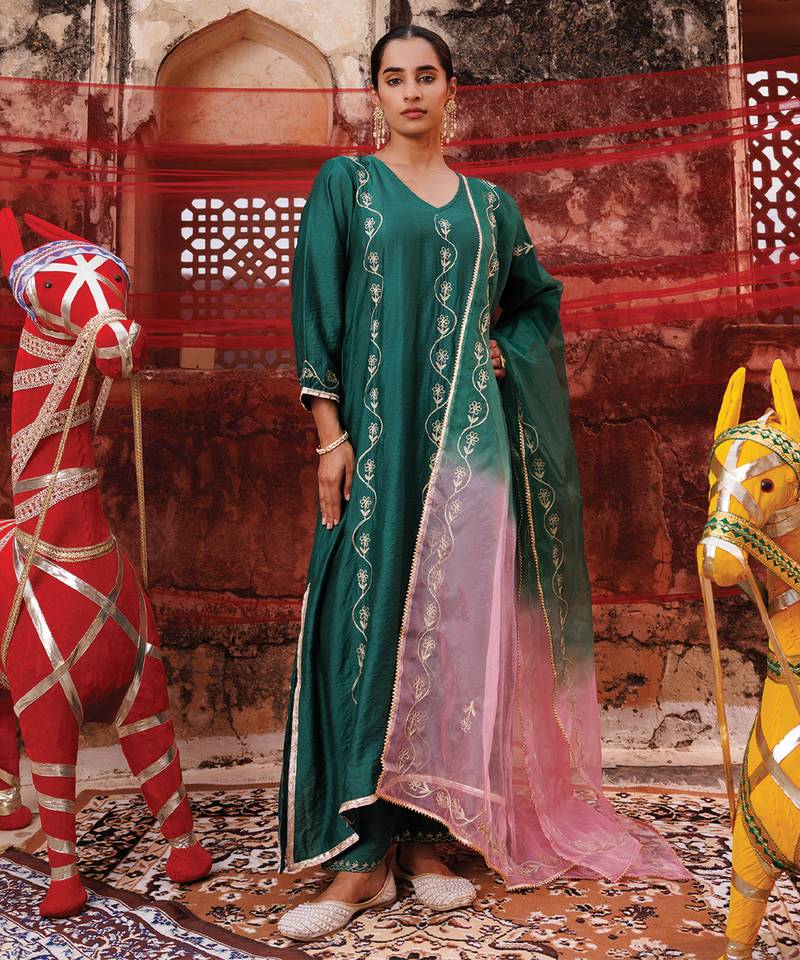 Dark Green Embroidered Chanderi Kurta Set With Dual Shaded Dupatta