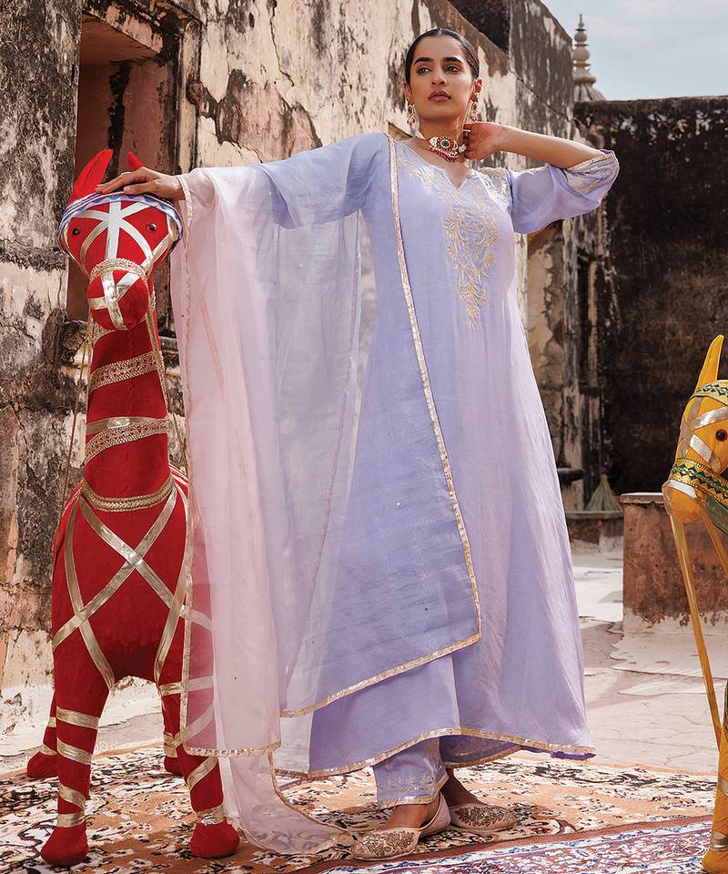 If you find the product for less we'll match it! Know MoreThis Lavender Embroidered Chanderi Kurta Set Features A Soothing Color With Intricate Detailing. The Soft Sheen Of The Fabric Enhances Its Elegance, Making It Ideal For Festive And Special Occasions. A Refined Outfit That Combines Comfort With Graceful And Modern Ethnic Style.