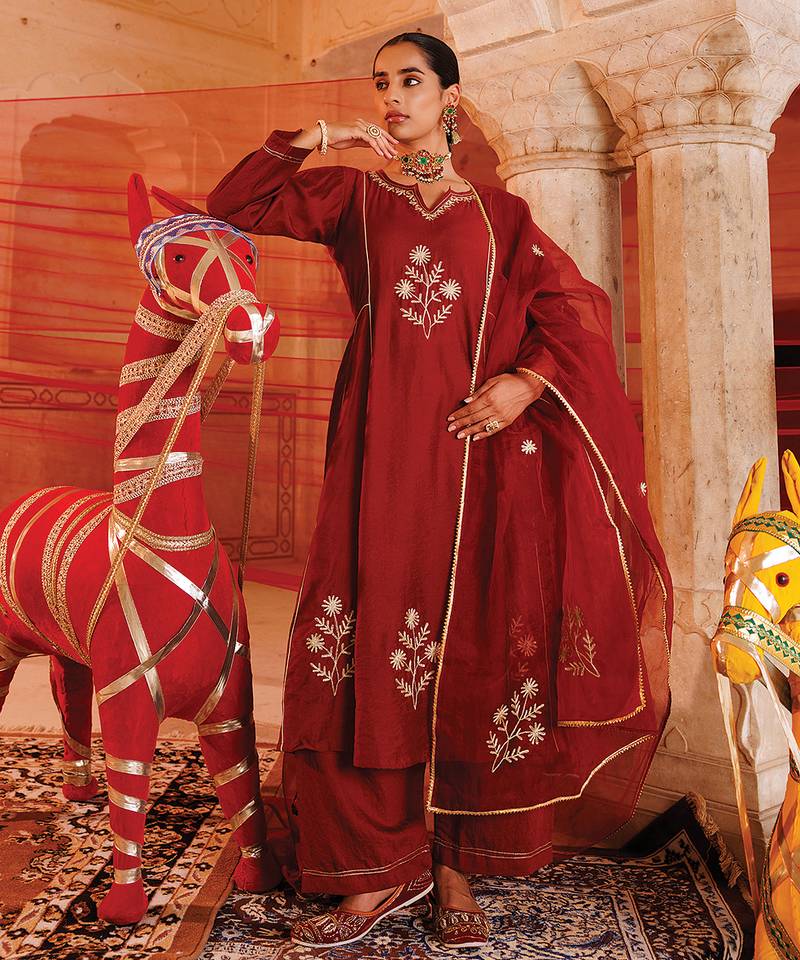 If you find the product for less we'll match it! Know MoreRich And Sophisticated, This Maroon Embroidered Chanderi Kurta Set Features Intricate Detailing With A Luxurious Finish. The Deep Hue Enhances Its Traditional Appeal, Making It Perfect For Festive Gatherings And Special Occasions, Offering A Timeless And Elegant Ethnic Look.