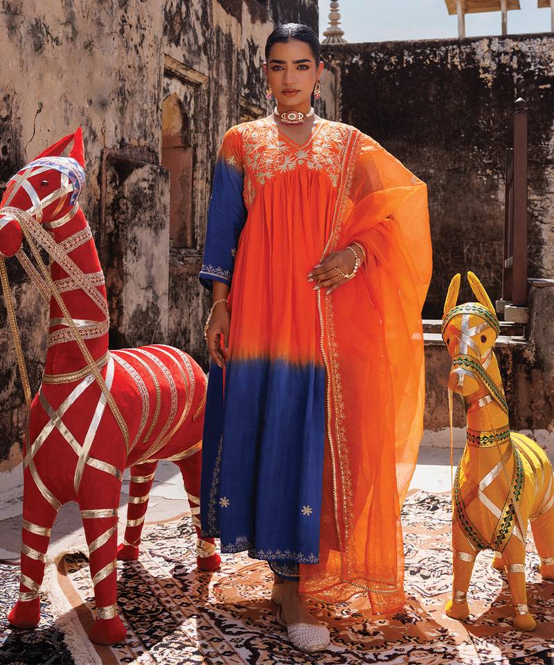If you find the product for less we'll match it! Know MoreThis dual -shaded Chanderi Kurta Set Showcases Vibrant Hues With Intricate Detailing On A Lustrous Base. The Lightweight Fabric Ensures Comfort, While The Colorful Design Adds A Festive Charm. Perfect For Celebrations, It Offers A Lively And Elegant Ethnic Look.