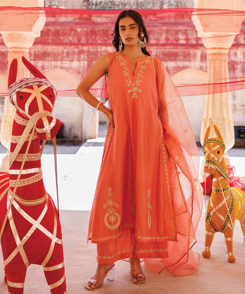 If you find the product for less we'll match it! Know MoreBright And Vibrant, This Orange Embroidered Chanderi Kurta Set Features Intricate Detailing With A Rich Sheen. Designed For Comfort And Elegance, It Is Perfect For Festive Celebrations. The Bold Color Adds Energy And Charm, Making It A Standout Addition To Your Ethnic Collection.