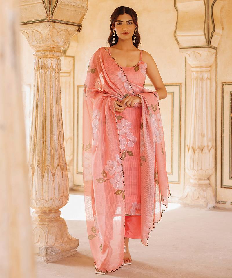 Peach Printed Cotton Kurta Set