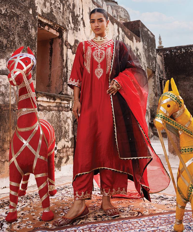 If you find the product for less we'll match it! Know MoreBold And Elegant, This Red Embroidered Chanderi Kurta Set Features Intricate Detailing On A Lustrous Fabric. The Rich Color Enhances Its Festive Appeal, While The Lightweight Texture Ensures Comfort. Perfect For Celebrations, It Adds A Striking And Traditional Charm To Your Ethnic Wardrobe.