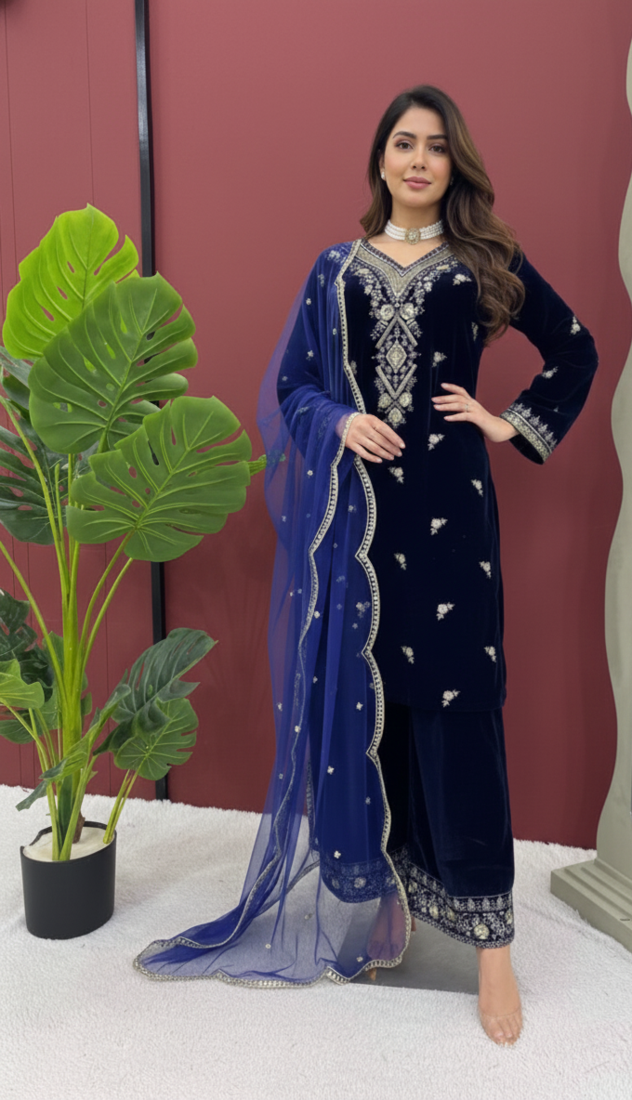 *Length* : 2.2 meter• Product Id : 4665816 • Package Details : 1 Top, 1 Bottom, 1 Dupatta • Type : Kurta Sets • Occasion : Wedding • Fabric : Velvet • Type : Beads • Look : Fashion • Sleeve : Full Sleeve • Neck Style : V Neck • Color : Navy Blue • Work : Solid • Stitching : Stitched General - Color and Texture may have slight variation. This happens because of photography.