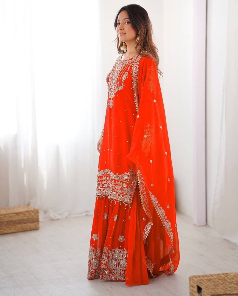 • Product Id : 4696423 • Package Details : 1 Top , 1 Bottom, 1 Dupatta • Type : Readymade Suits For Women • Occasion : Party Wear • Work : Embroidered • Type : Sequins Work • Look : Designer • Sleeve : Full Sleeve • Fabric : Georgette • Color : Orange • Stitching : Stitched • Neck Style : Scoop Neck Payments [+]