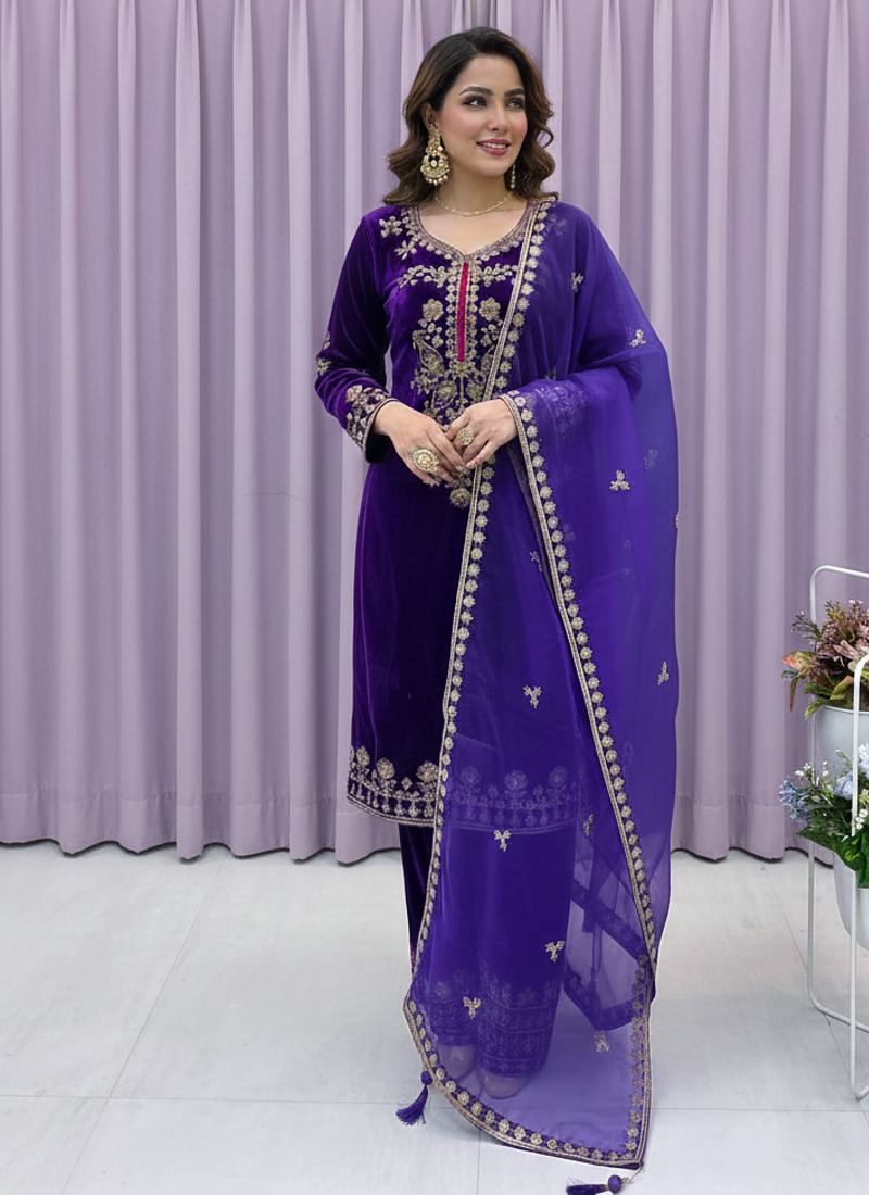 Purple Color Velvet Suit With Dupatta Designer Palazzo