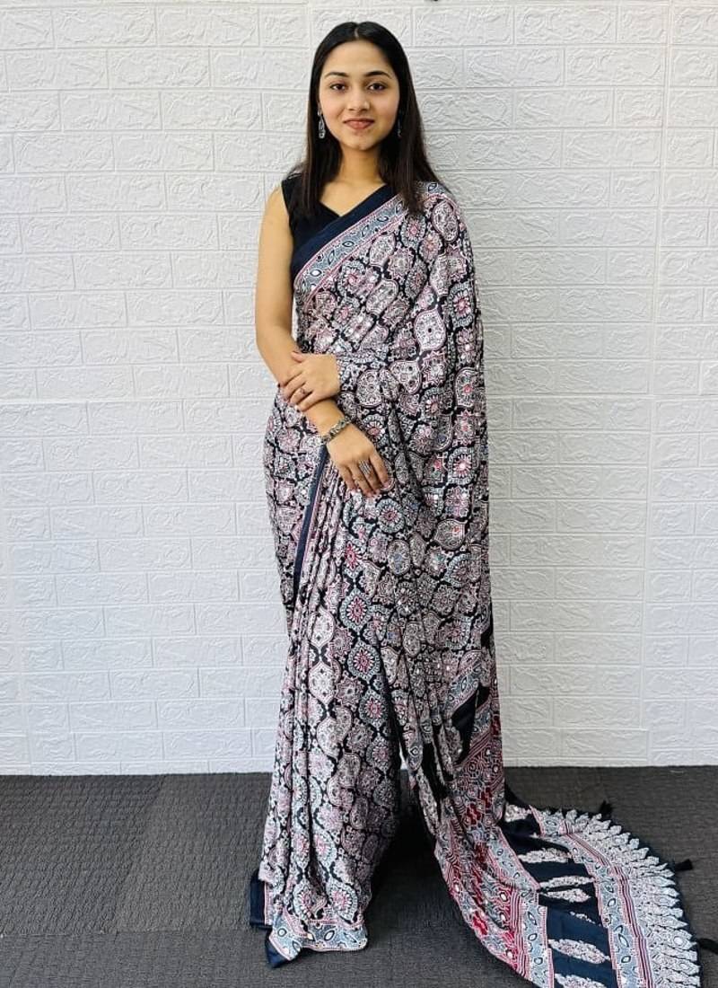 Blouse: 0.80 Meter (Unstitched)• Saree : Color- Black / Fabric- Satin • Blouse : Color- Same As Saree / Fabric- Satin Saree Details