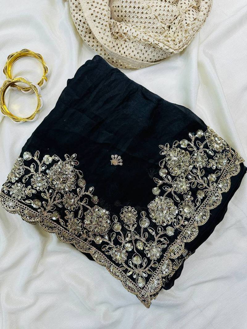 Black Color Sequence Embrodairy Cuttwork Silk Saree