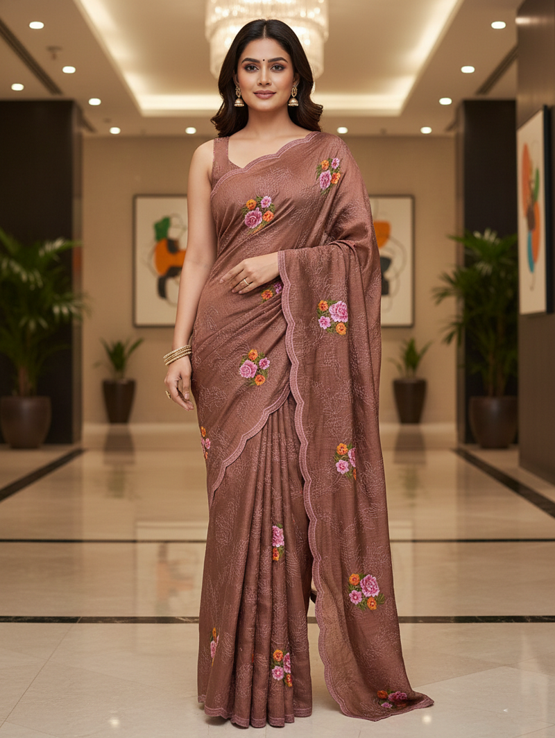 Work: Solid Plain Blouse with Slub Effect with Designer Malti Thread Embroidery work with Cutwork• Saree : Color- Brown / Fabric- Silk Blend • Blouse : Color- Light Brown / Fabric- Silk Blend Saree Details