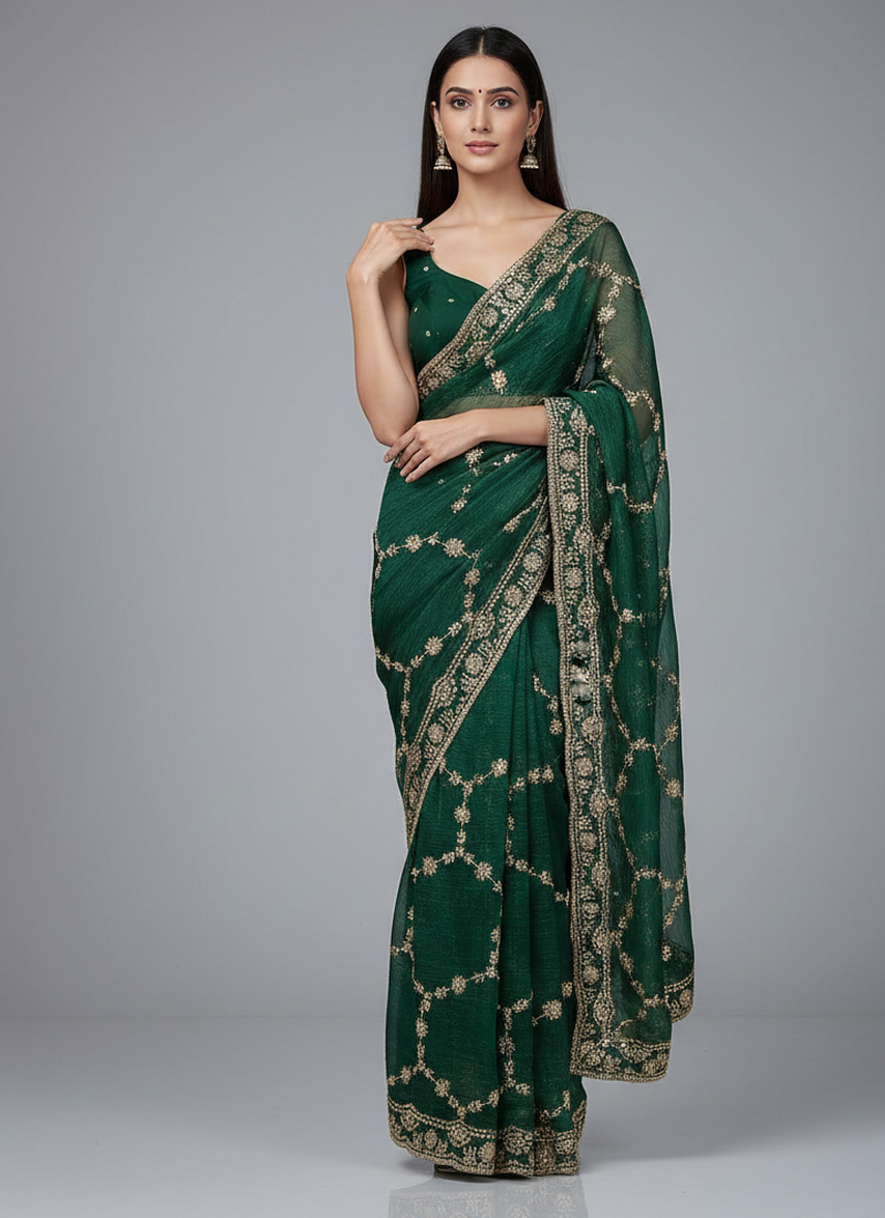 Green Color Sequins With Zari Thread Embroidery Work Chiffon Saree