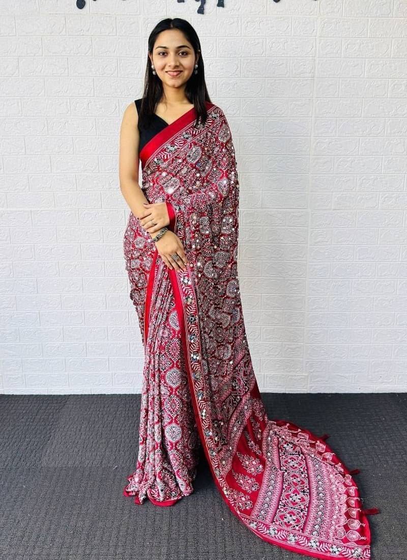 Maroon Color Heavy Mirror Work With Elegant Latkan Pallu Border Work Satin Saree