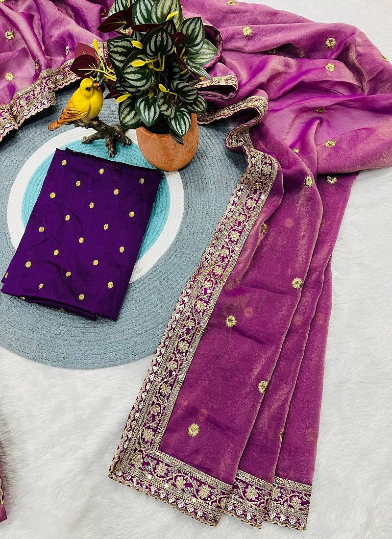 Meganta Color Sequins With Zari Thread Embroidered Butti Silk Saree