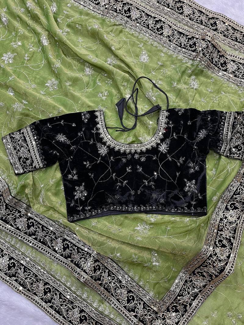 Work: Designer Embroidery work of Silver jari and Sequins.• Saree : Color- Mehendi / Fabric- Silk Blend • Blouse : Color- Black / Fabric- Velvet Saree Details