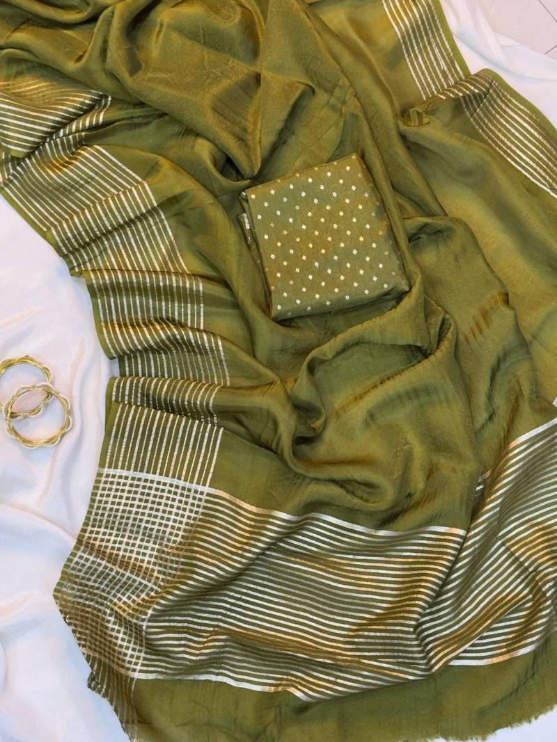 Russian blouse with zari butti.• Saree : Color- Mehendi / Fabric- Silk Blend • Blouse : Color- Mehandi Green / Fabric- Silk Blend Saree Details