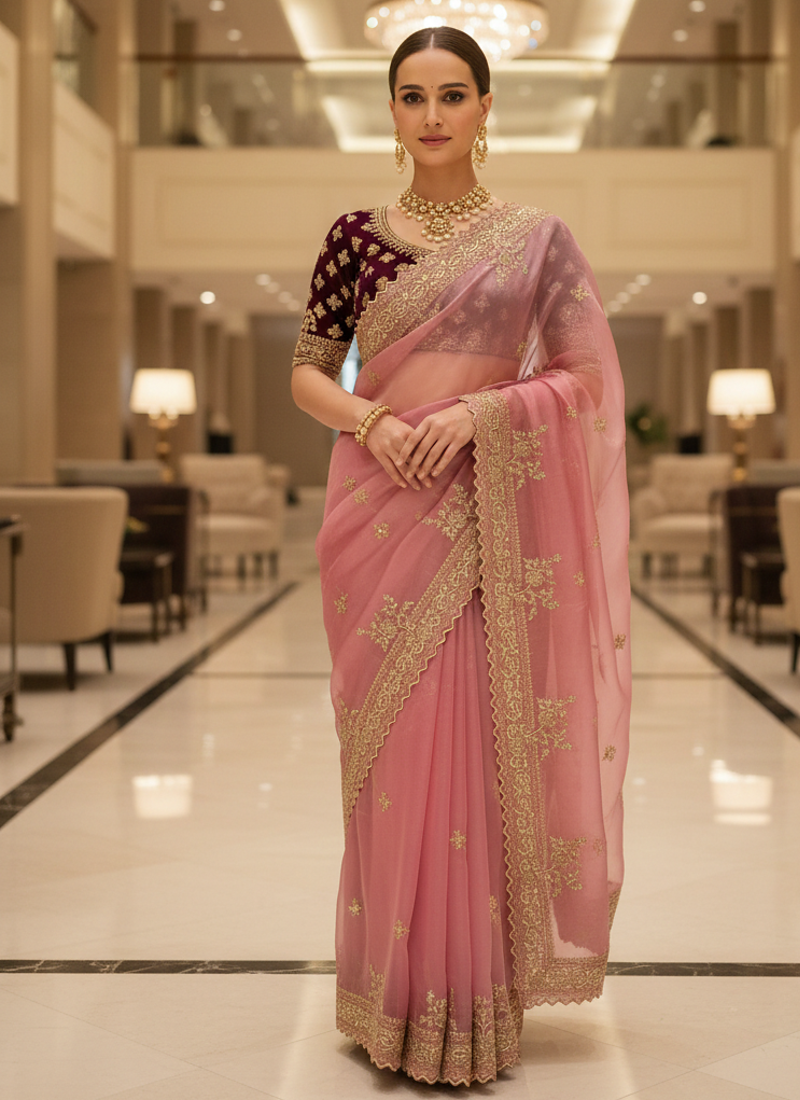 • Border : Designer Border • Fabric Of : Satin • Color : Pink Blouse Details