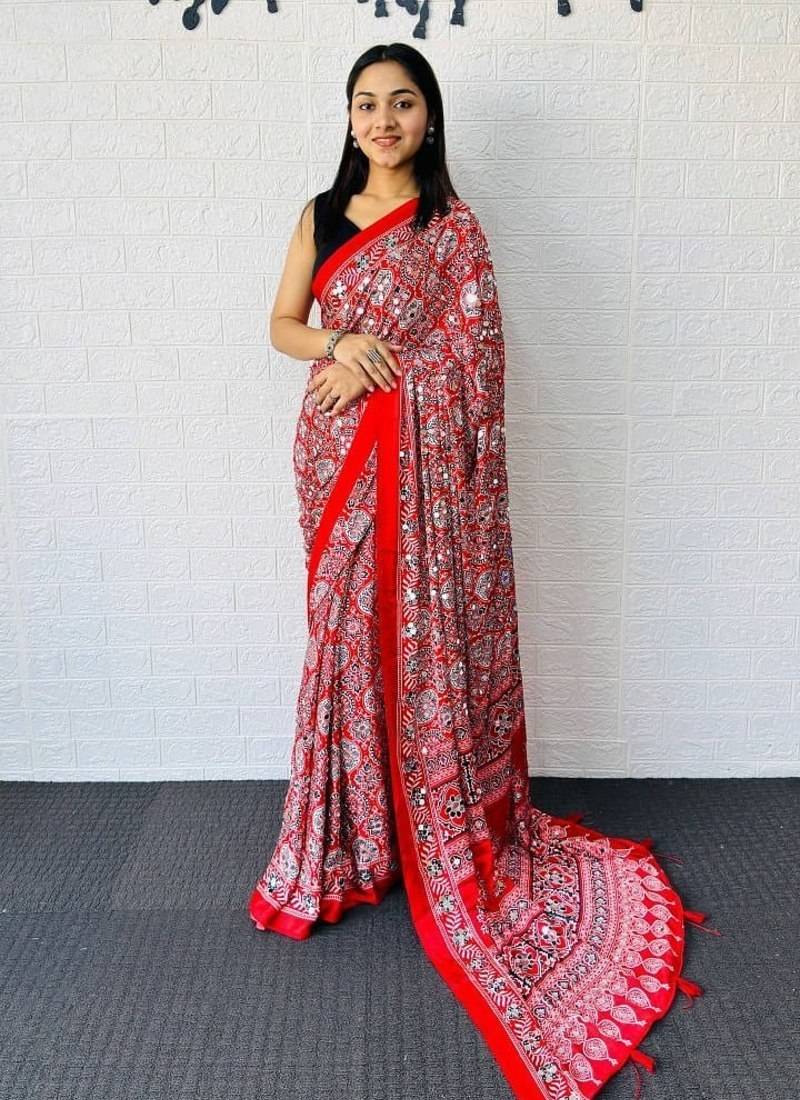 Red Color Heavy Mirror Work With Elegant Latkan Pallu Border Work Satin Saree