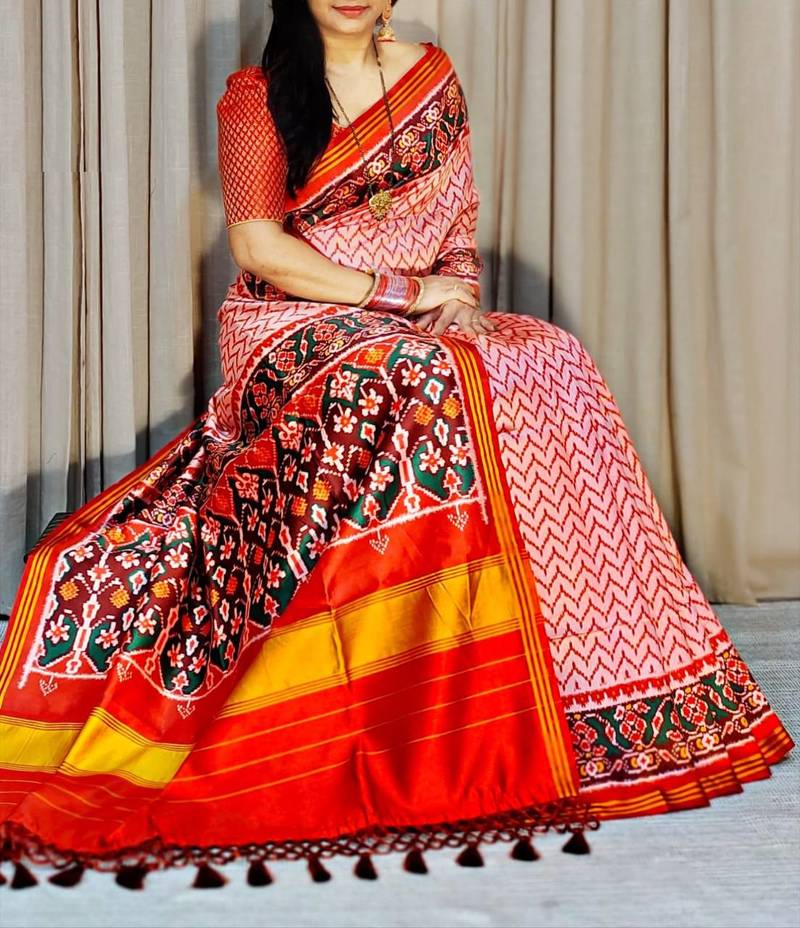 If you find the product for less we'll match it! Know MoreFabric - Handloom Silk Patola with Trending designs & Lagadi Patta & weaved zari border & Tassels