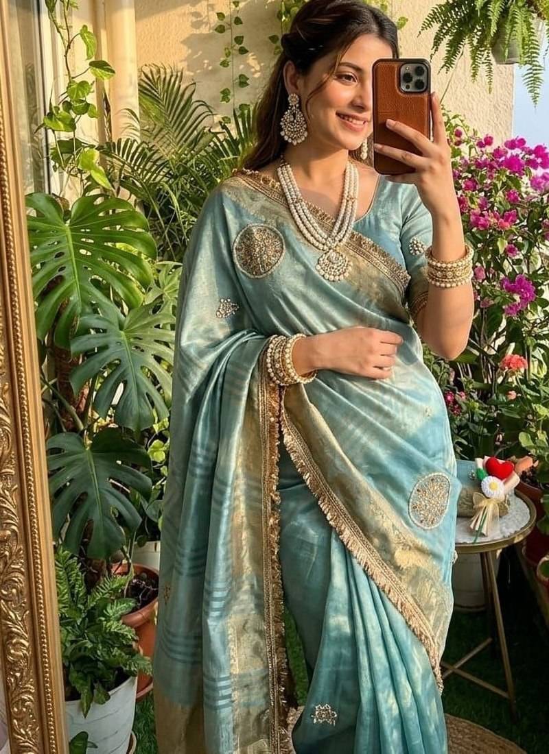 Sky Blue Color Weaving Jacquard Border And Sequence Lace Border Satin Saree