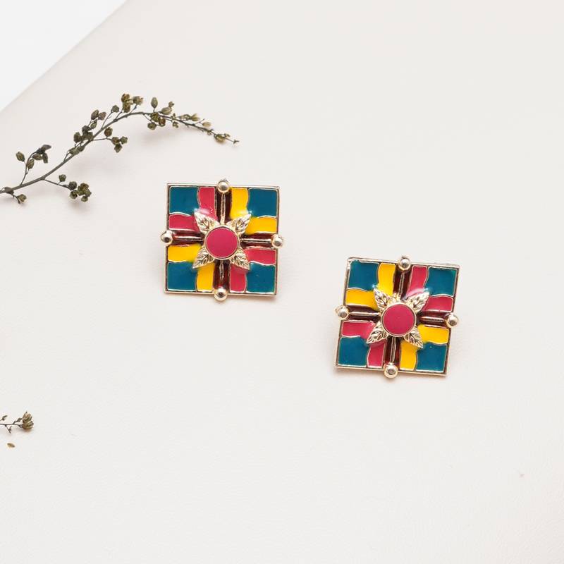 Abhika Creations Handcrafted Colour Block Square Studs With Leaf Motif Centre