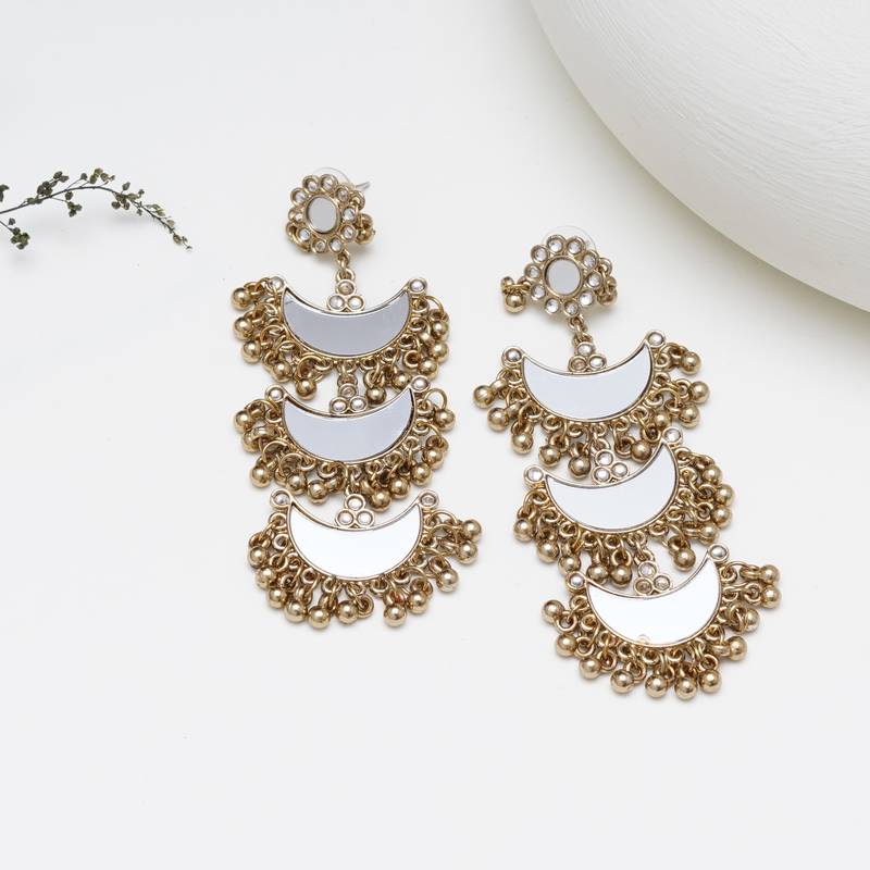 Abhika Creations Multi Layer Mirror Crescent Dangler Earrings With Gold Bead Fringe