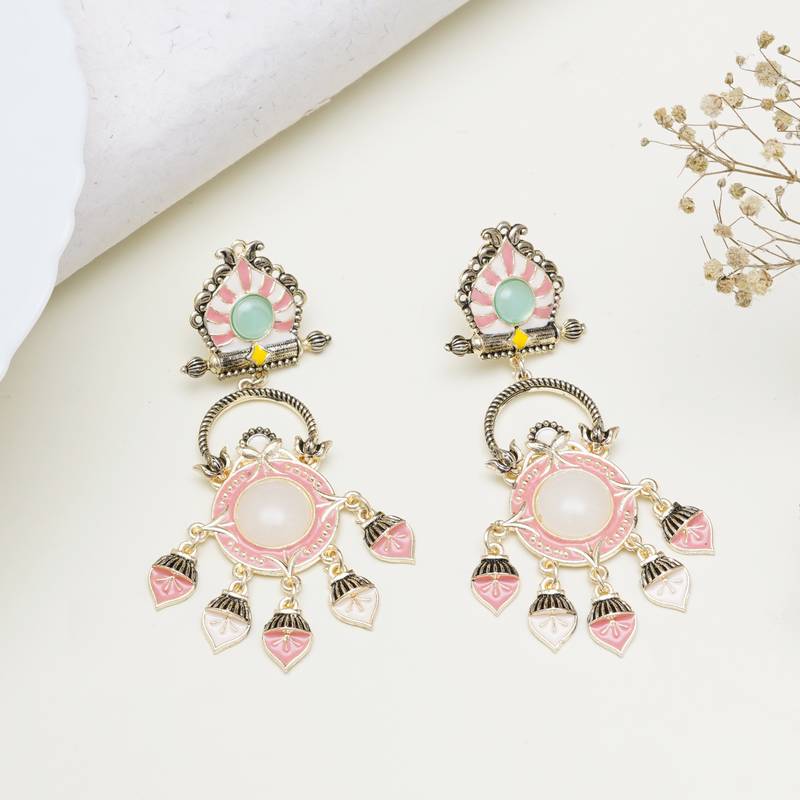 Abhika Creations Multicolour Pastel Enamel Earrings With Mint Stud & Pink Dangling Charms