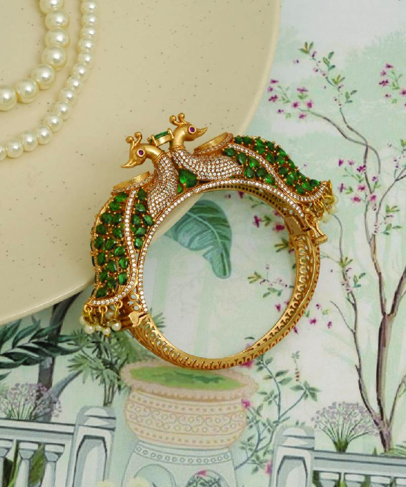 If you find the product for less we'll match it! Know MoreThis Gold Plated Heritage Kada Features Rich Green Stones Set In An Intricate Traditional Design. The Elegant Detailing Enhances Its Regal Appeal, Making It Perfect For Festive Wear. A Timeless Accessory That Complements Ethnic Outfits Beautifully, Adding Sophistication And A Touch Of Classic Charm To Your Look.