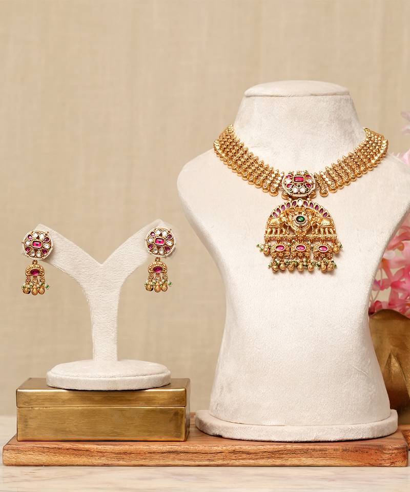 • Product Id : 4696213 • Package Details : 1 Necklace / 1 Pair Of Earrings • Type : Necklace Sets • Occasion : Wedding • Look : Traditional • Jewellery Work : Kundan • Color : Multicolor • Plating : Yellow Gold • Base Material : Copper Payments [+]