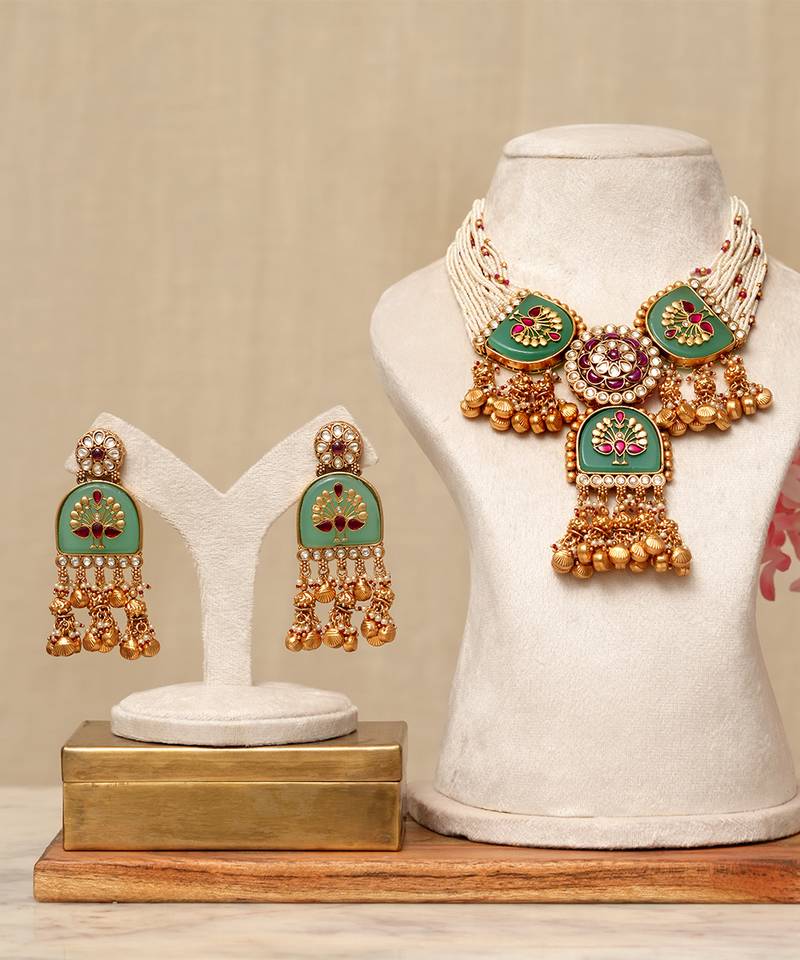 • Product Id : 4696219 • Package Details : 1 Necklace / 1 Pair Of Earrings • Type : Necklace Sets • Occasion : Wedding • Look : Traditional • Jewellery Work : Kundan • Color : Multicolor • Plating : Yellow Gold • Base Material : Copper Payments [+]