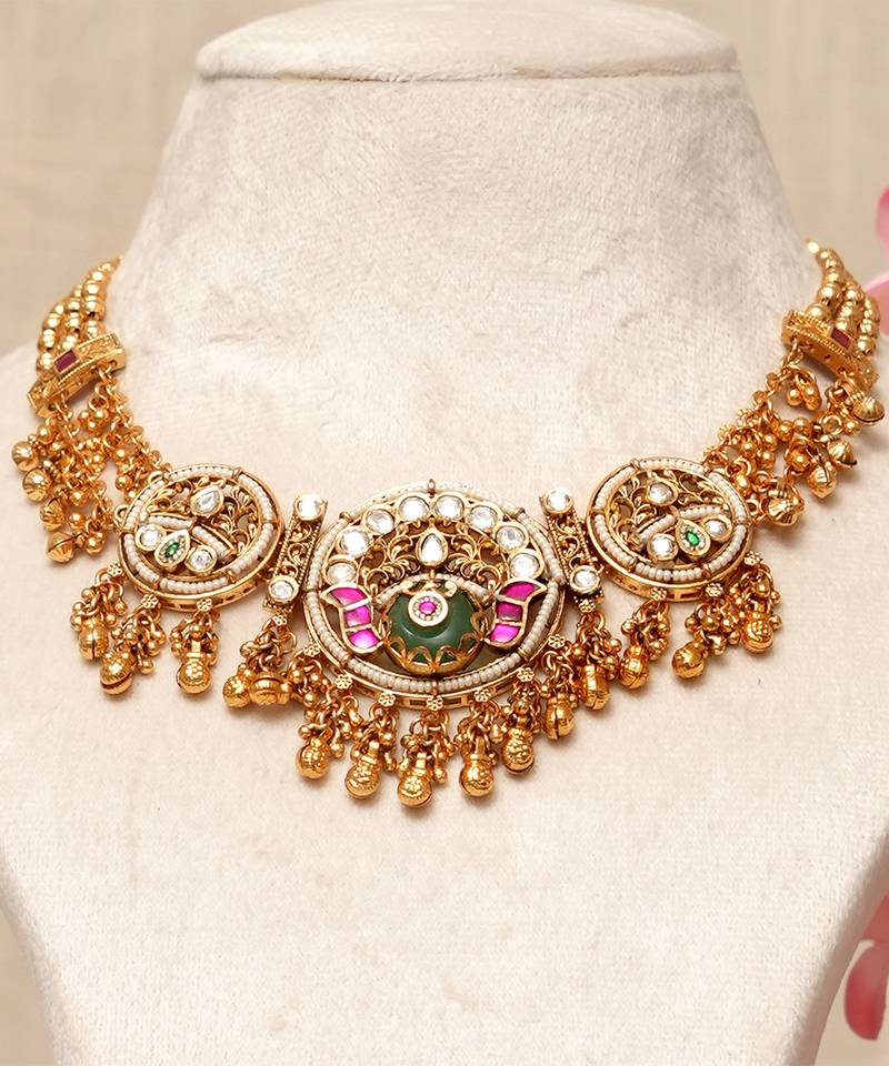 • Product Id : 4696230 • Package Details : 1 Necklace / 1 Pair Of Earrings • Type : Necklace Sets • Occasion : Wedding • Look : Traditional • Jewellery Work : Kundan • Color : Multicolor • Plating : Yellow Gold • Base Material : Copper Payments [+]
