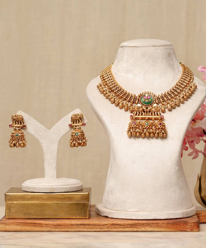 • Product Id : 4696214 • Package Details : 1 Necklace / 1 Pair Of Earrings • Type : Necklace Sets • Occasion : Wedding • Look : Traditional • Jewellery Work : Kundan • Color : Multicolor • Plating : Yellow Gold • Base Material : Copper Payments [+]