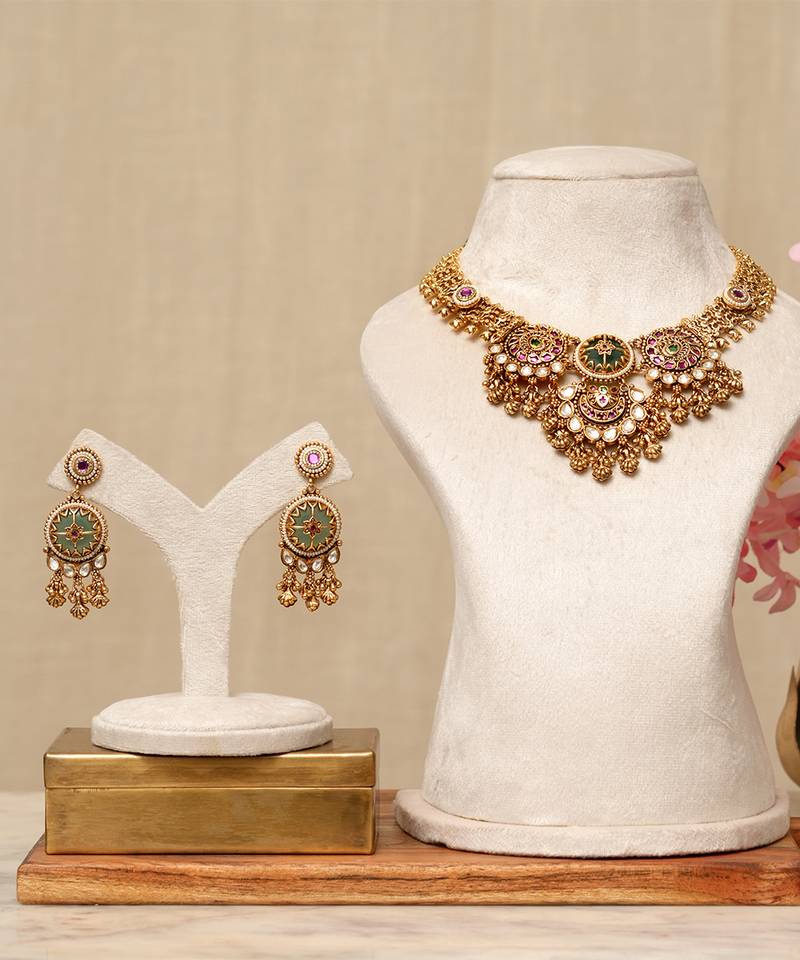 • Product Id : 4696215 • Package Details : 1 Necklace / 1 Pair Of Earrings • Type : Necklace Sets • Occasion : Wedding • Look : Traditional • Jewellery Work : Kundan • Color : Multicolor • Plating : Yellow Gold • Base Material : Copper Payments [+]
