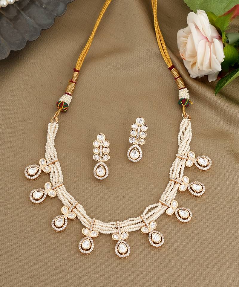• Product Id : 4702608 • Package Details : 1 Necklace / 1 Pair Of Earrings • Type : Necklace Sets • Occasion : Wedding • Look : Traditional • Jewellery Work : Kundan • Color : Gold • Plating : Yellow Gold • Base Material : Copper Payments [+]