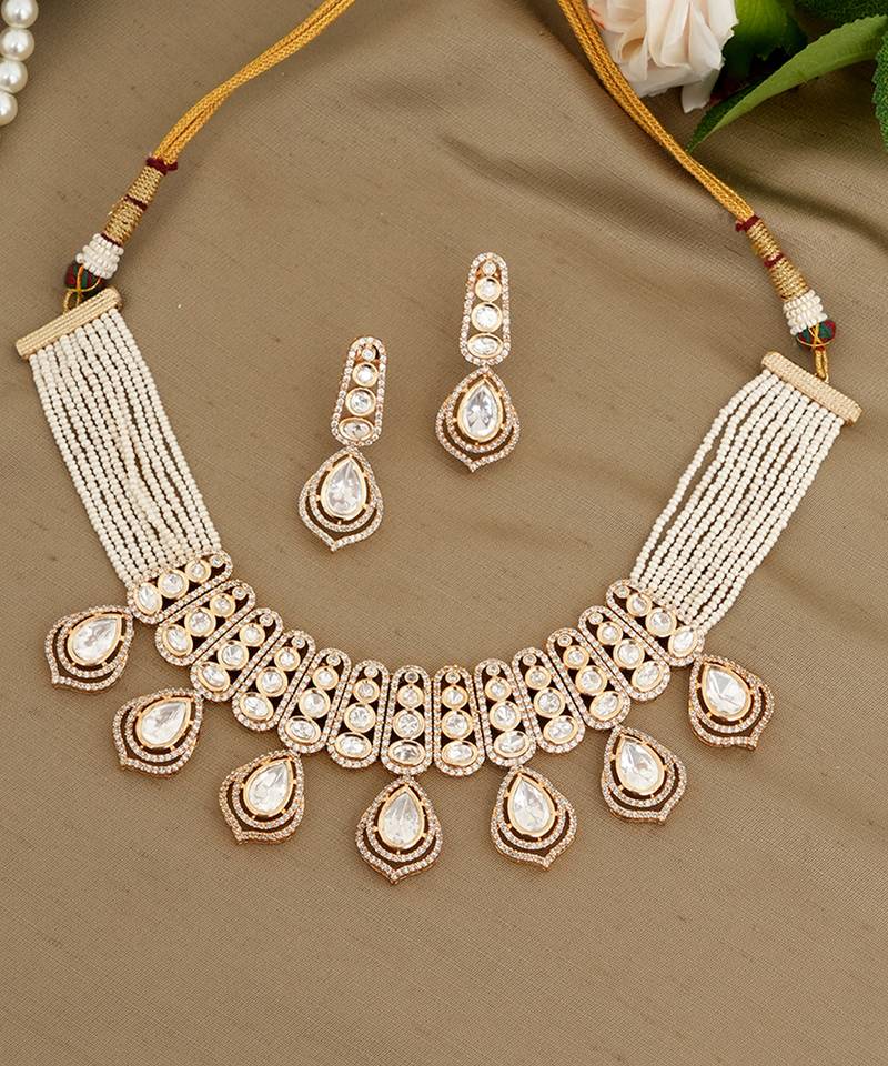 • Product Id : 4702616 • Package Details : 1 Necklace / 1 Pair Of Earrings • Type : Necklace Sets • Occasion : Wedding • Look : Traditional • Jewellery Work : Kundan • Color : Gold • Plating : Yellow Gold • Base Material : Copper Payments [+]