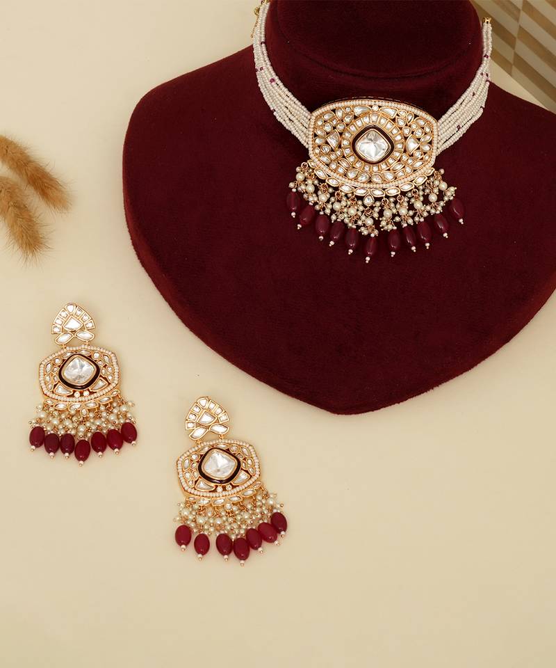 Gold Plated Kundan Red Stones Necklace Set Is A Striking And Elegant Piece That Radiates Traditional Charm. Featuring Intricate Kundan Craftsmanship And Vibrant Red Stones, It Adds A Rich, Festive Touch To Any Ethnic Outfit. Perfect For Weddings, Celebrations, And Special Occasions, This Necklace Set Exudes Timeless Beauty And Sophistication.