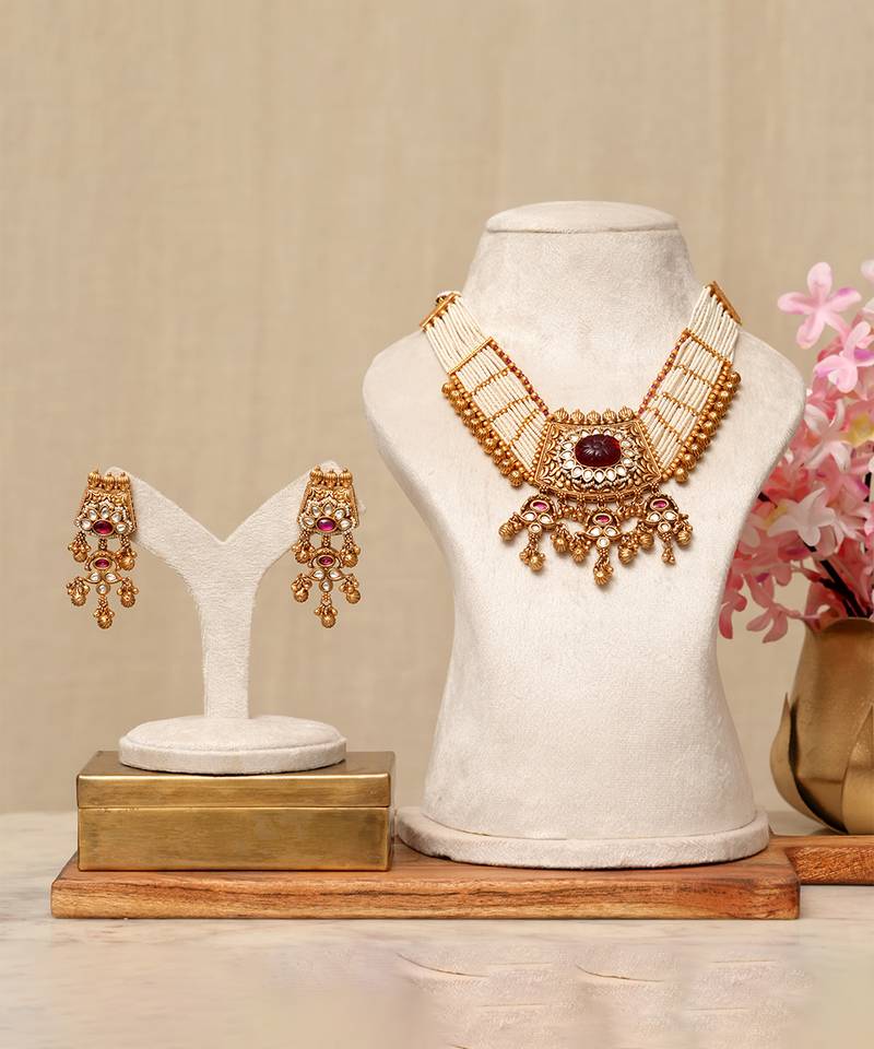 Gold Plated Kundan Red Stones Necklace Set Is A Striking And Elegant Piece That Radiates Traditional Charm. Featuring Intricate Kundan Craftsmanship And Vibrant Red Stones, It Adds A Rich, Festive Touch To Any Ethnic Outfit. Perfect For Weddings, Celebrations, And Special Occasions, This Necklace Set Exudes Timeless Beauty And Sophistication.