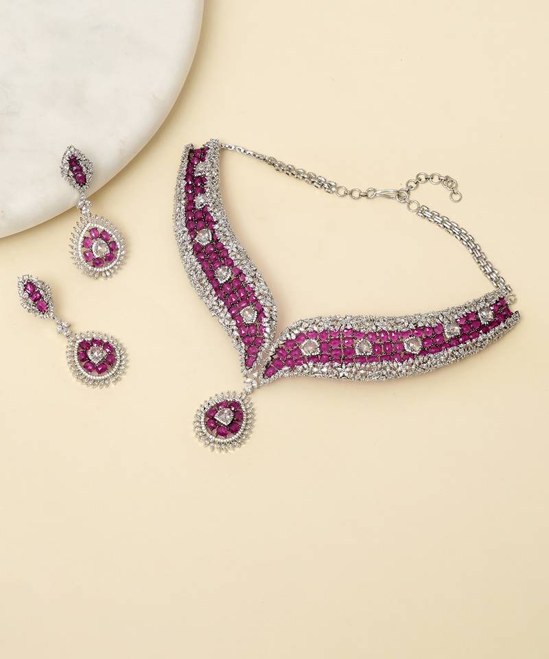 Zircon red stones necklace set Is A Striking And Elegant Piece That Radiates Traditional Charm. Featuring Intricate Kundan Craftsmanship And Vibrant Red Stones, It Adds A Rich, Festive Touch To Any Ethnic Outfit. Perfect For Weddings, Celebrations, And Special Occasions, This Necklace Set Exudes Timeless Beauty And Sophistication.