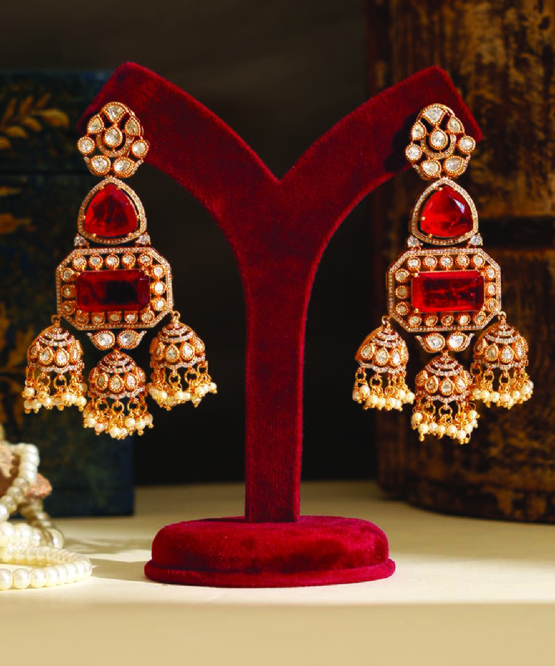 Components: 1 Pair Of Jhumkas• Color : Red • Work : Gold Plated Earings Details