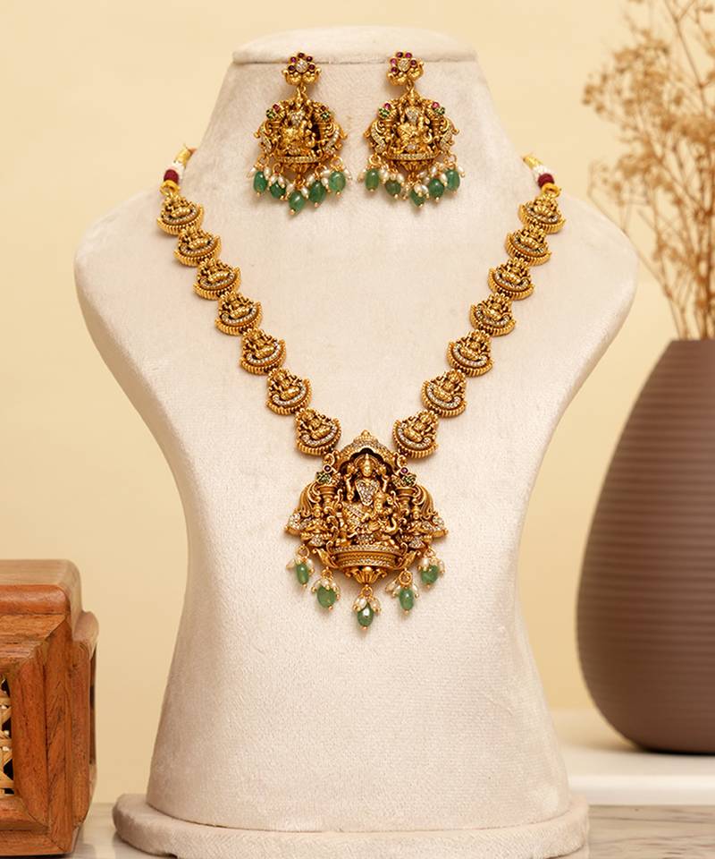 Inspired By Classic Temple Jewelry, This Gold Plated Temple Necklace Set Features Detailed Craftsmanship And A Rich Antique Finish. The Beautifully Designed Motifs Enhance Ethnic Outfits Effortlessly. Ideal For Weddings, Poojas, And Cultural Celebrations, This Set Brings Timeless Tradition And Graceful Sophistication To Your Jewelry Collection.