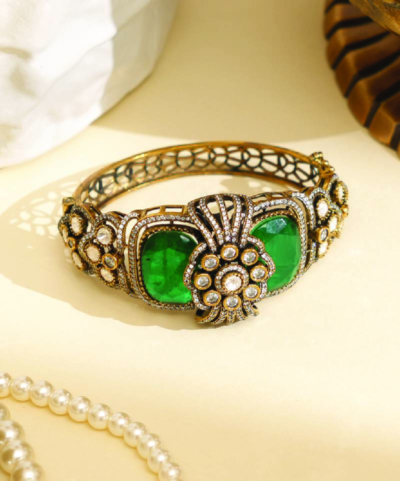 If you find the product for less we'll match it! Know MoreThis Zircon Green Stone Royal Kada Blends Intricate Craftsmanship With A Bold Design. The Vibrant Stones Create A Striking Look, Making It Ideal For Festive Wear. A Versatile Accessory That Enhances Your Outfit With Elegance, Offering A Perfect Balance Of Tradition And Contemporary Style.