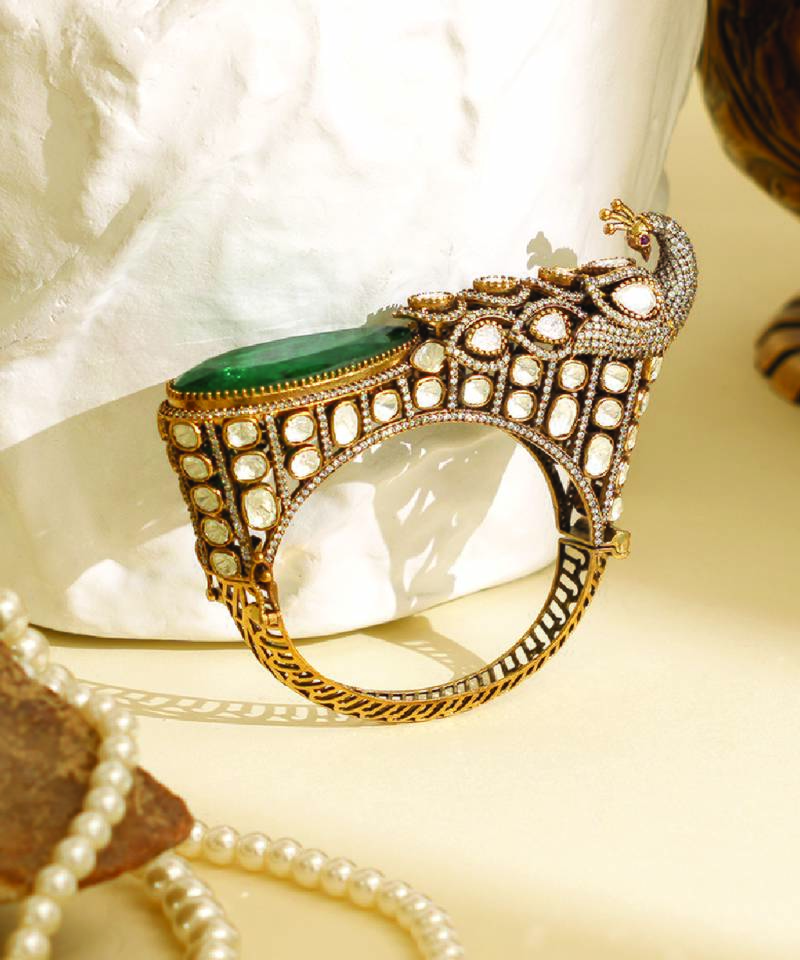 If you find the product for less we'll match it! Know MoreDesigned With Precision, This Zircon Green Stone Royal Kada Blends Sparkle And Elegance Seamlessly. The Vibrant Green Stones Enhance Its Luxurious Feel, Making It Perfect For Special Occasions. Its Sturdy Yet Stylish Design Ensures A Comfortable Fit While Adding A Refined Charm To Your Overall Look.