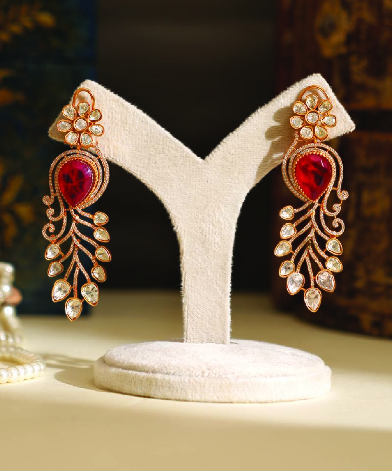 If you find the product for less we'll match it! Know MoreCrafted With Shimmering Zircon And Red Stones, These Danglers Offer A Striking And Elegant Appeal. The Detailed Design Enhances Their Luxurious Look, Making Them Ideal For Special Occasions. A Perfect Accessory To Add Sparkle And Sophistication To Your Overall Ensemble.