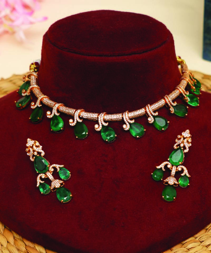 If you find the product for less we'll match it! Know MoreThis Zircon Studded Choker Necklace Set Features Radiant Green Stones That Add Brilliance And Elegance. The Intricate Design Enhances Its Modern Appeal, Making It Perfect For Both Festive And Party Wear. A Stylish Accessory That Elevates Your Look With A Touch Of Sparkle And Sophistication.
