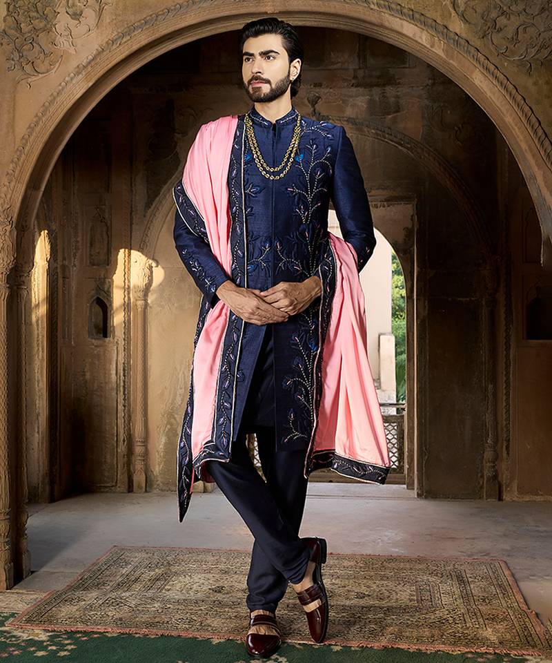 Blue Embroidered Rawsilk Sherwani