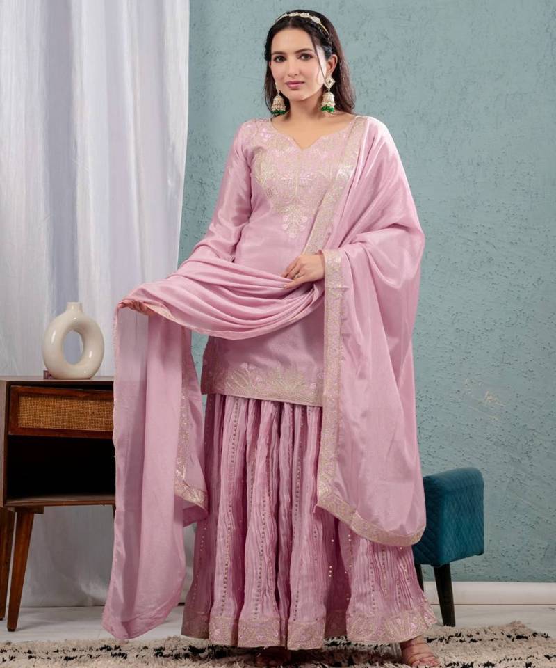 Baby Pink Festive Wear Designer Pure Heavy Chinnon Silk Heavy Embroidery Coding Sequence Work Readymade Suit Stitched