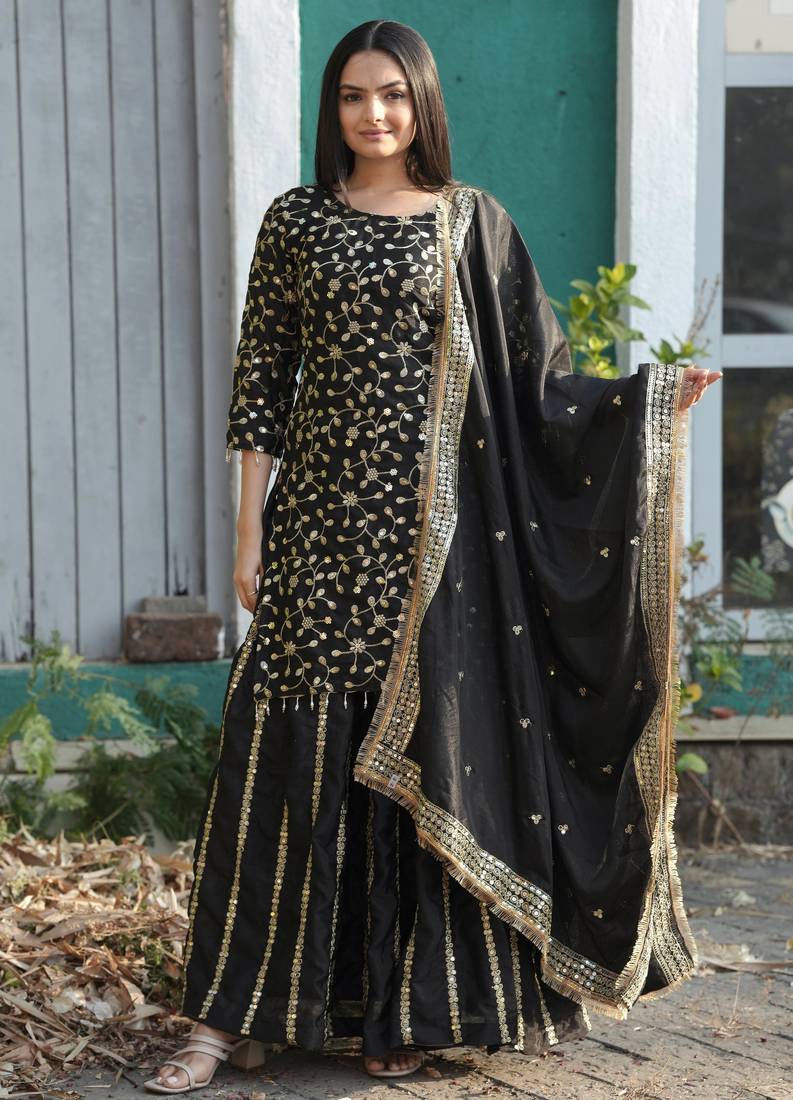 • Product Id : 4760266 • Package Details : 1 Top/1 Bottom/1 Dupatta • Type : Readymade Suits For Women • Look : Traditional • Sleeve : Quarter Sleeve • Color : Black • Fabric : Fancy Fabric • Work : Work • Stitching : Stitched General - Color and Texture may have slight variation. This happens because of photography.