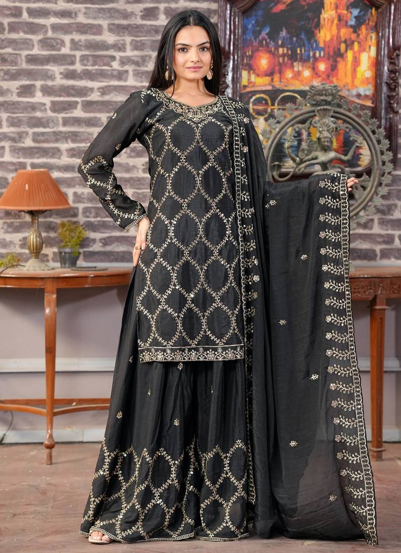 Black Festive Wear Designer Chinon Sequence Embroidery Work Readymade Suit Stitched
