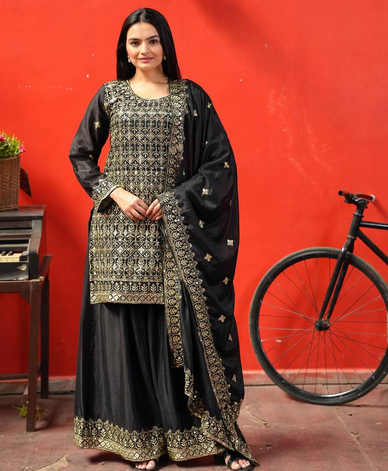 Black Festive Wear Designer Chinon Sequence Embroidery Work Readymade Suit Stitched