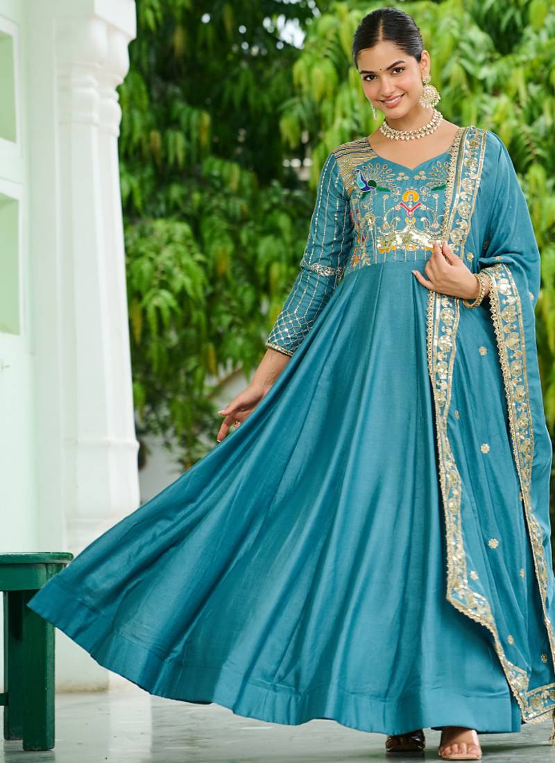 Blue Festive Wear Designer Vichitra Silk Sequins, Multi Thread & Zari Embroidered Work Readymade Suit Stitched